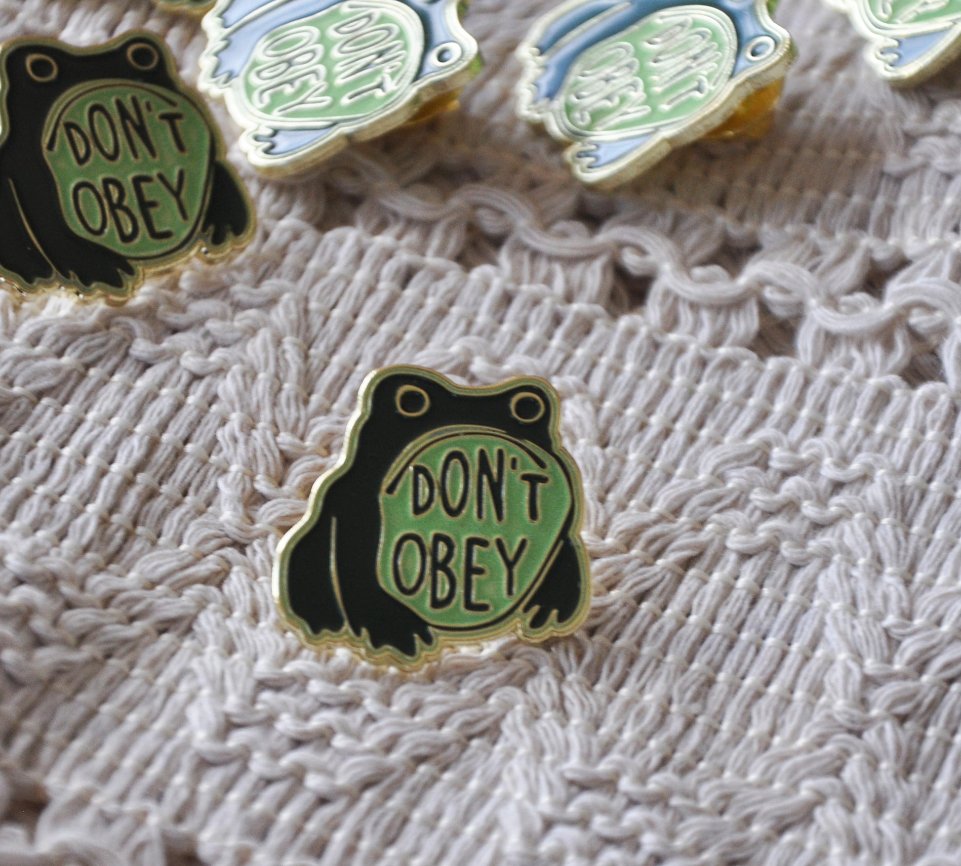 This glow-in-the-dark enamel lapel pin features a rebellious little frog paired with the words “Don't Obey” — a bold reminder that questioning authority and standing up for justice are acts of courage.